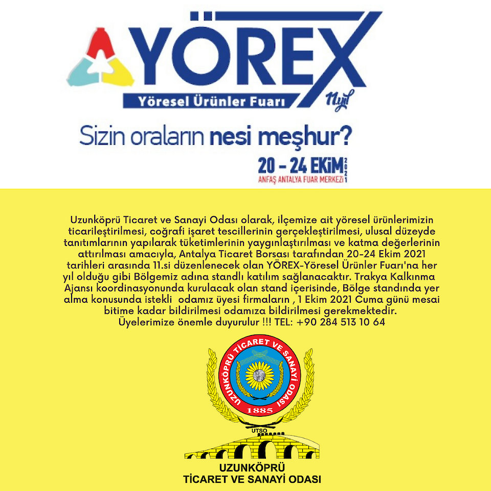 20-24 Ekim 2021 Tarihleri Arasında 11. Si Düzenlenecek Olan YÖREX-YÖRESEL Ürünler Fuarı'na Katılım Hakkında Duyuru!!!