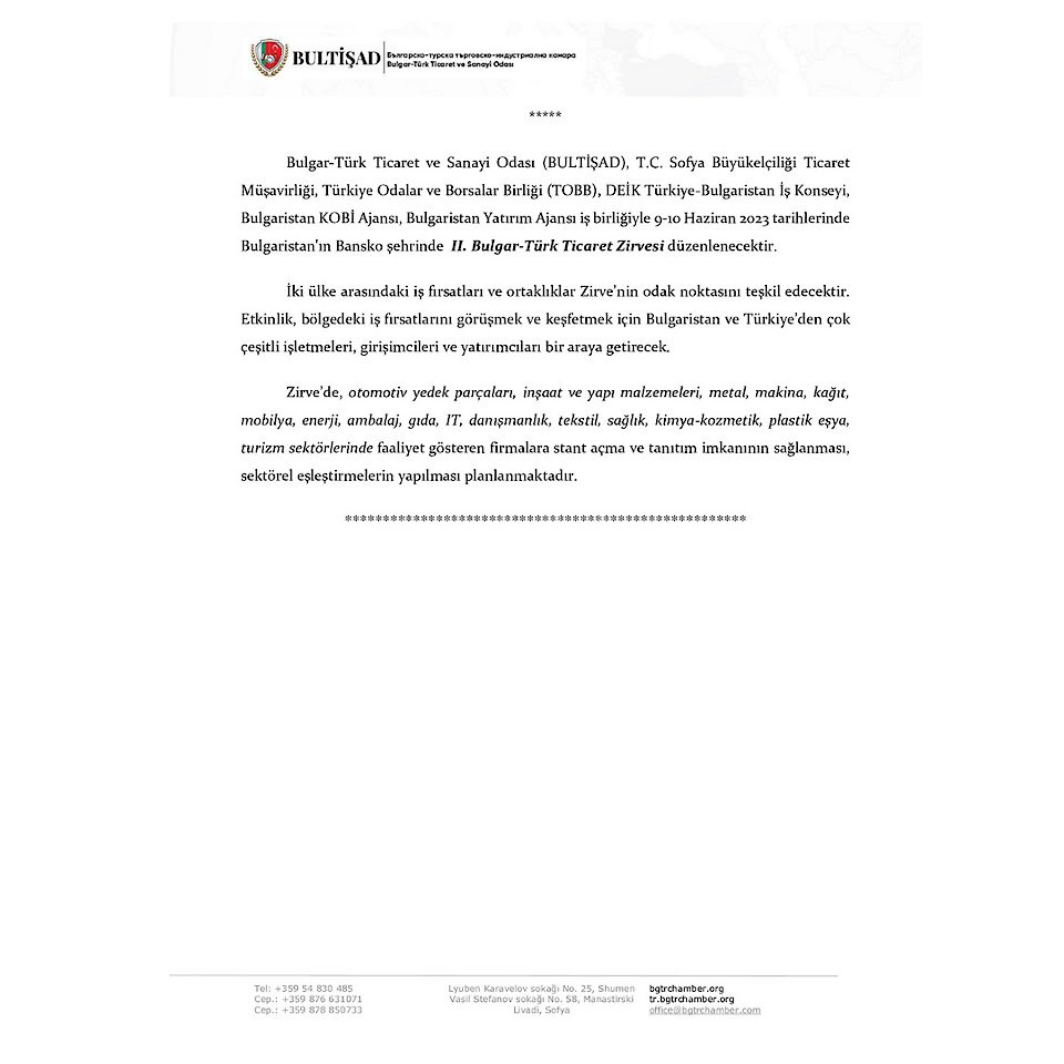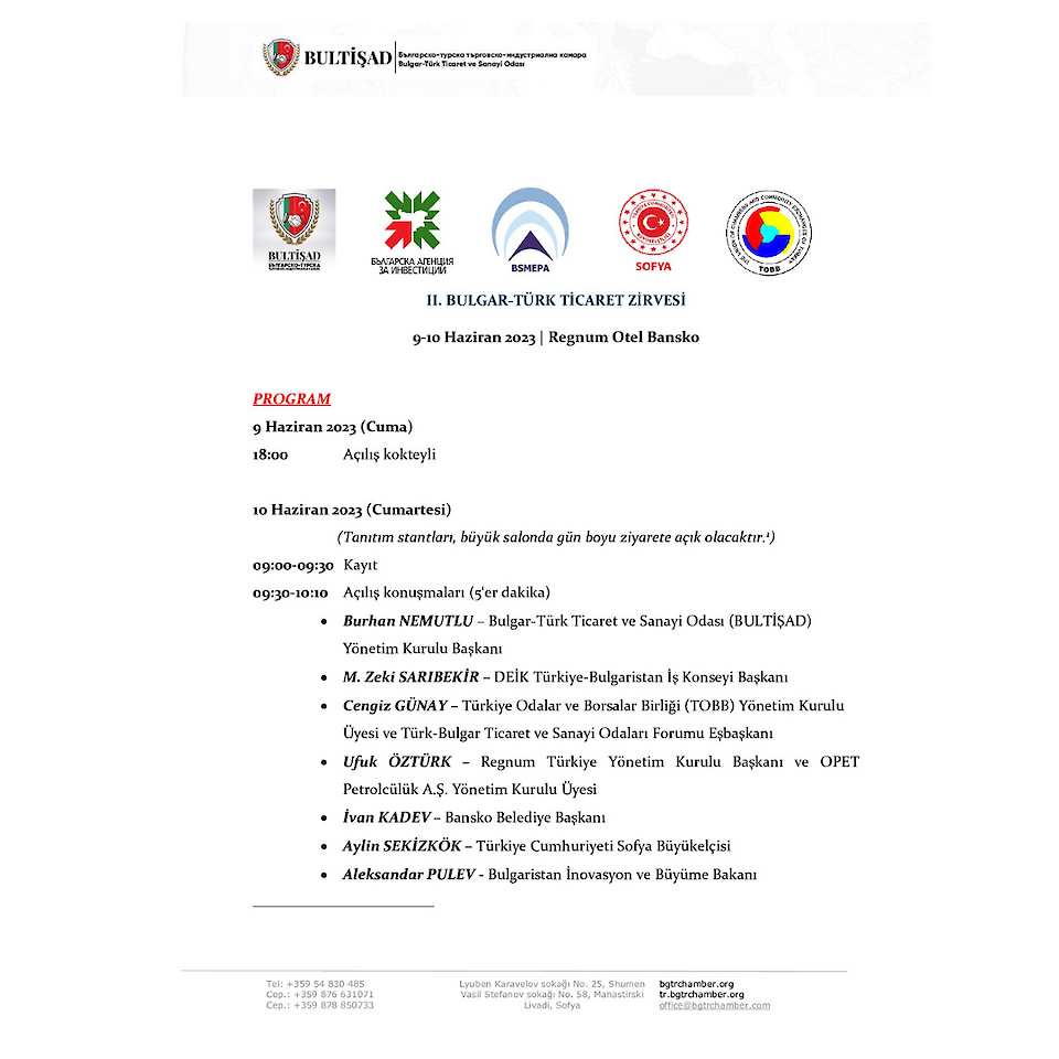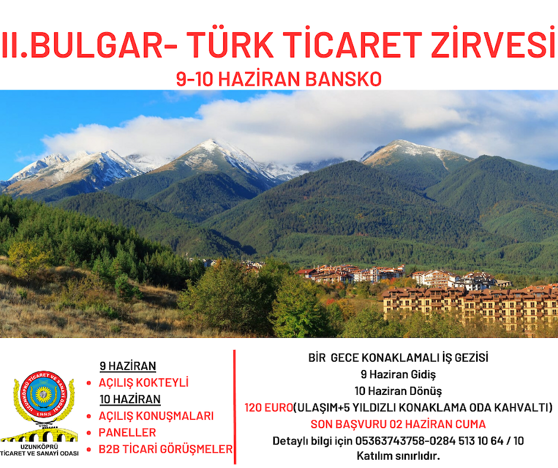 Türkiye Odalar ve Borsalar Birliğimiz (TOBB) ve Bulgaristan Türk Ticaret ve Sanayi Odası (BULTİŞAD) tarafından düzenlenen II. BULGAR-TÜRK TİCARET ZİRVESİ 9-10 Haziran tarihlerinde Bulgaristan Bansko’da gerçekleştirilecektir.