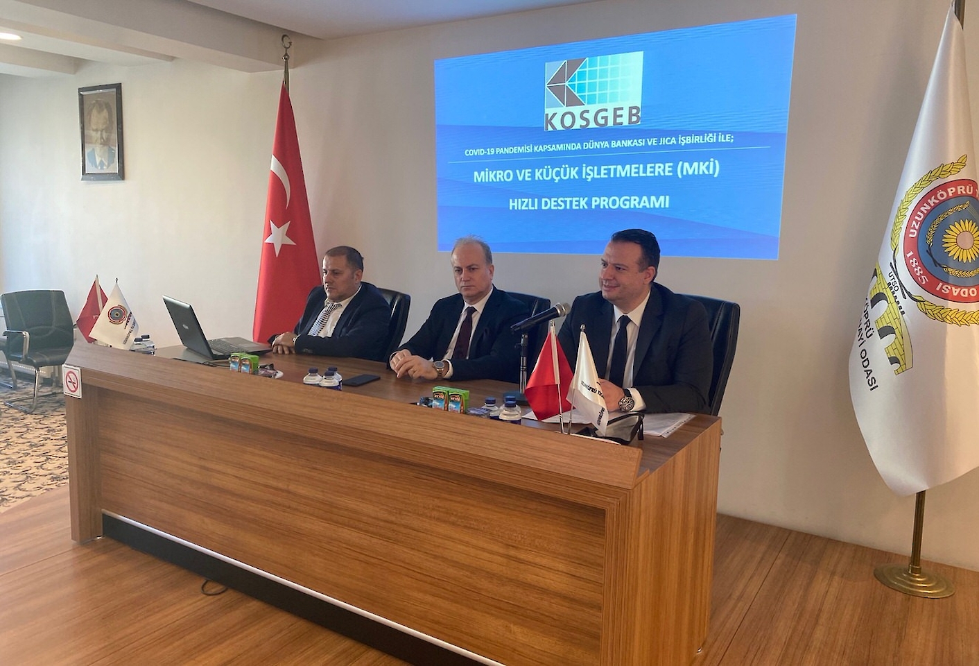 Uzunköprü Ticaret ve Sanayi Odası ve KOSGEB Edirne İl Müdürlüğü iş birliği ile düzenlenen ‘’COVİD 19 KAPSAMSAMINDA MİKRO ve KÜÇÜK İŞLETMELERE HIZLI DESTEK PROGRAMI’’ hakkında bilgilendirme toplantısı KOSGEB AB ve Dış İlişkiler Dairesi Başkanı Selim Serkan ERCAN’ ın katılımlarıyla 20.01.2022 Perşembe günü Uzunköprü Ticaret ve Sanayi Odası Toplantı Salonu’nda gerçekleştirildi.