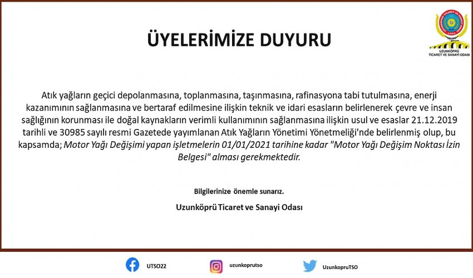 Atık yağların geçici depolanmasına, toplanmasına, taşınmasına, rafinasyona tabi tutulmasına, enerji kazanımının sağlanmasına ve bertaraf edilmesine ilişkin teknik ve idari esasların belirlenerek çevre ve insan sağlığının korunması ile doğal kaynakların verimli kullanımının sağlanmasına ilişkin usul ve esaslar 21.12.2019 tarihli ve 30985 sayılı resmi Gazetede yayımlanan Atık Yağların Yönetimi Yönetmeliği'nde belirlenmiş olup, bu kapsamda; Motor Yağı Değişimi yapan işletmelerin 01/01/2021 tarihine kadar "Motor Yağı Değişim Noktası İzin Belgesi" alması gerekmektedir.
