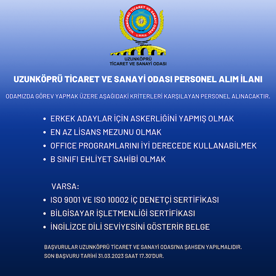 UZUNKÖPRÜ TİCARET VE SANAYİ ODASI PERSONEL ALIM İLANI ODAMIZDA GÖREV YAPMAK ÜZERE AŞAĞIDAKİ KRİTERLERİ KARŞILAYAN PERSONEL ALINACAKTIR.