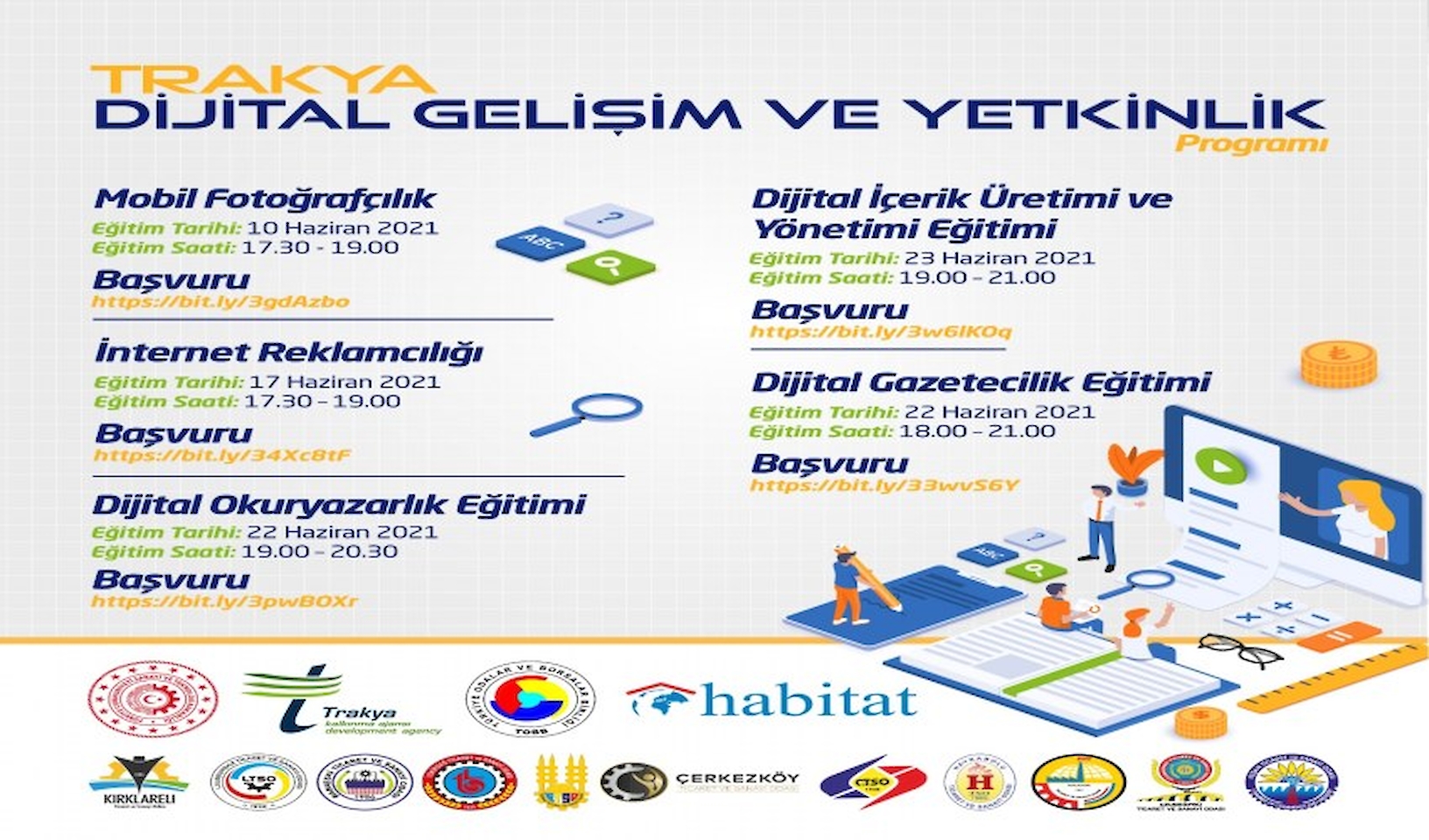 Habitat Derneği, TOBB ve Trakya Kalkınma Ajansı iş birliğinde Trakya için Dijital Gelişim ve Yetkinlik Eğitim Programı başlıyor. 21. Yüzyıl eğitim becerileri ile şekillendirilmiş online eğitim programı ile yaz döneminde kurumsal ve bireysel kapasite gelişimlerinin yanında çocuklara, gençlere ve yetişkinlere yönelik eğitimlerimiz devam edecek.